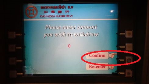 引き出す現金の金額を、数字キーを使って入力します。入力できたら”Confirm”(確認)を押します。