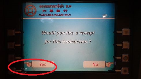 レシートが必要かどうか尋ねられますので、必ず”Yes”を押しましょう。後でトラブルになった場合の証明になります。(現金が出てこなかったにもかかわらず、口座から引き落とされていたということがありました。日本に帰ってからそのことに気づき、カード会社にクレームを入れ、救済されました。)
