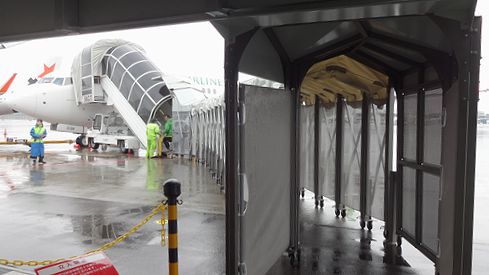 サテライトから飛行機へはエプロンを徒歩で移動することになりますが、なんと、飛行機までジャバラ式の屋根付きパーティション(エプロンルーフ)が伸びていました。すごい!これがあれば、雨の日でも濡れることなく搭乗することが出来ますね!以前はこんなものはなかったので、大幅に改善しました。