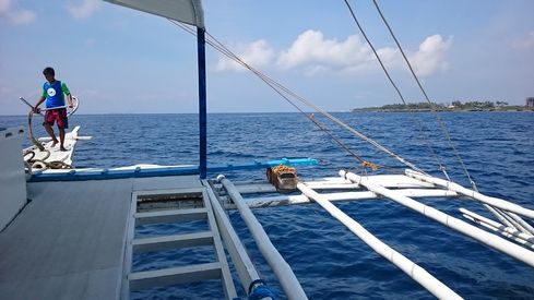 ▲セブの沖合は内海であるため波も穏やかで、さらにアウトリガーのおかげもあり船酔するほどの揺れはありません。真っ青な空、真っ青な海、心地よい海風。快適そのもののクルーズでした。
