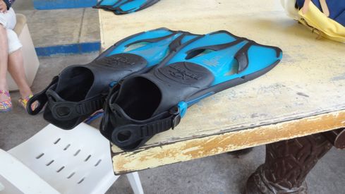 ▲説明を受けた後は、スノーケリングに使うフィンのフィッティングを行います。