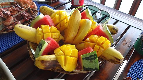▲デザートに、バナナ、マンゴー、スイカの盛り合わせ。豪華ですね。もう、お腹いっぱいです。