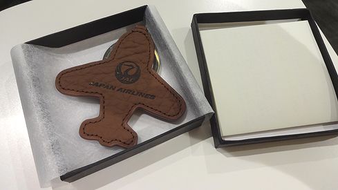 ▲JALマイル利用の工場見学では、記念品としてJALの特製キーホルダーを頂きました。こちらがそのキーホルダーで、国際線ファーストクラス”JAL SUITE”のシートに使われてるの同じ革で作られています。ちなみに、2015年5月からは、特製のチタン製キーホルダーになります。