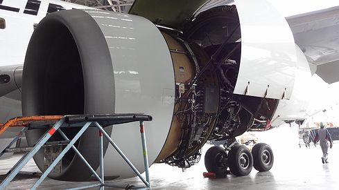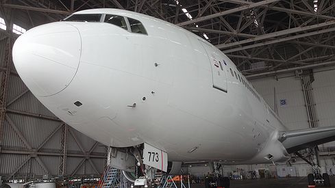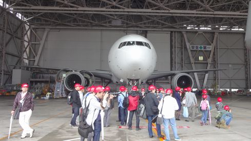 ▲さて、見学会後半は、実際に整備工場に入ってナマの機体を間近に見学することができます。巨大な格納庫の中に、3機入っていました。