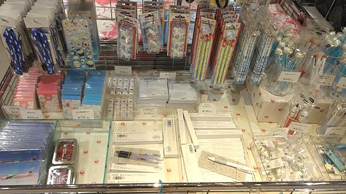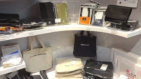 ▲JALのトラベルウォレット、エコバッグ、他にも様々なグッズが販売されていました。
