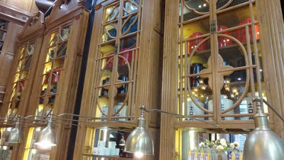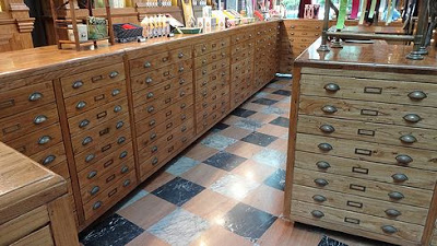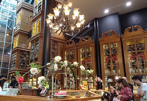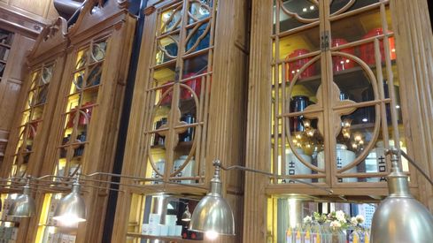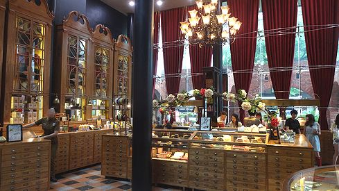 ▲店内は非常にユニーク。背の高いガラス窓に重厚なカーテン、レトロなシャンデリア、木目調の巨大な戸棚に引き出しがたくさんついたカウンター。店の周りとは全く異る別世界です。