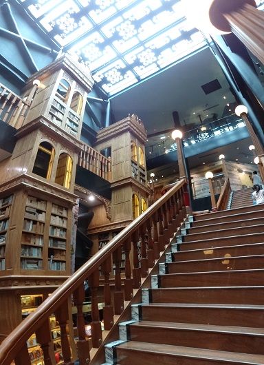 ▲中央部は4階まで吹き抜けになっていて、巨大な階段が印象的です。ガラスの天窓から自然光が降り注いでいます。