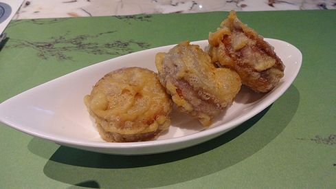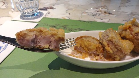 ▲天ぷらの中は、タロイモのペーストが入っていました。お味は、しつこくないサツマイモのようで、こちらもあっさり系。衣がパリパリで、とても美味しく頂きました。