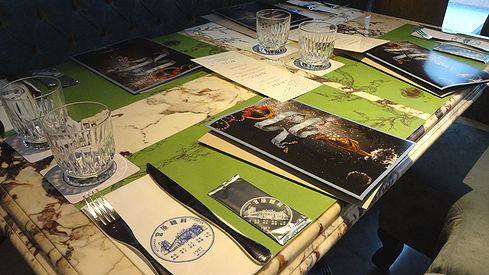 ▲大理石のテーブルに、食器類がセットされていました。