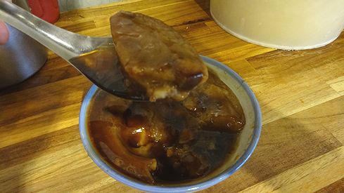 ▲こちらが富盛號の碗粿。もちもちした食感の蒸したご飯に、オリジナルのソースを欠けていただきます。ご飯の中には肉などの具がゴロゴロ入っていて食べごたえ十分。すりニンニクやチリソースなどの薬味をかけて食べると、味が変わって楽しめます。ぺろりと食べてしまえるのでお勧めです。