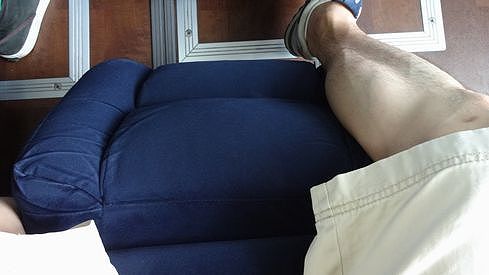▲シートピッチも十分で、足元はとてもゆったりとしています。前の座席がリクライニングしてきても問題なし。