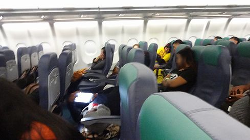 ▲長時間のフライトなので、皆さんややお疲れの様子です。横3席の肘掛けを上に上げ、ベッドにして寝ている人もいました。