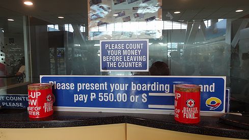 ▲さて、出国審査の前にターミナル利用料支払いカウンターがあるので、こちらで550ペソ(約1,600円)を納めましょう。(追記:2015年2月1日以降に発券された航空券については、施設使用料が航空券代金と併せて徴収されるようになりましたので、こちらに立ち寄る必要はなくなりました。)