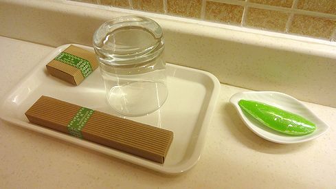 ▲アメニティグッズはやや貧弱かも。ただ、葉っぱを模した緑色の石鹸がカワイイですね。