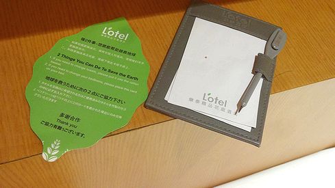 ▲枕元にはメモ用紙と、ロテル利用の注意書きがありました。このホテルは、かなり環境に配慮しているようで、洗濯などはできるだけ減らすよう促していました。
