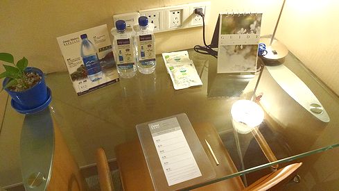 ▲ガラス製のライティングデスクには、かわいい鉢植えと、ミネラルウォーター(有料)などが置かれていました。