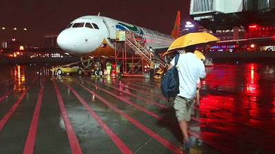 ▲さて、搭乗開始となりました。ボーディングブリッジを利用せずに、ターミナルから歩いて飛行機に乗り込みます。雨が降っていたのですが、搭乗客全員に傘を貸してくれました。