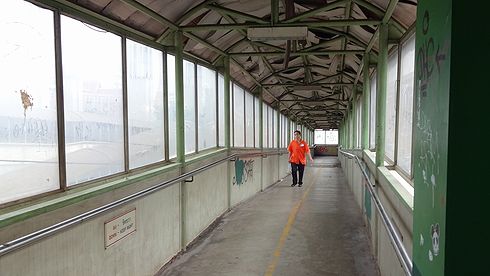 ▲鉄扉を開けと外に出ます。すると緑色に塗られた連絡橋が先ほどの通路と平行に伸びていました。
