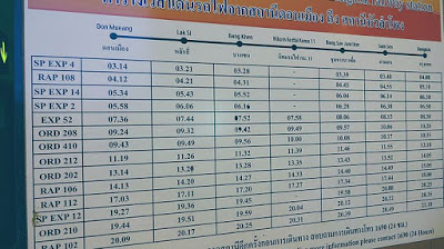 ▲出口の右側には、ドンムアン駅からバンコク・フワランポーン駅(正式名称クルンテープ駅)までの時刻表がありました。クリックすると画像を拡大できます。これを見ると、ドンムアン駅からバンコクまでの列車は、1日に15本しかありません。1本逃すと2時間待ちです。