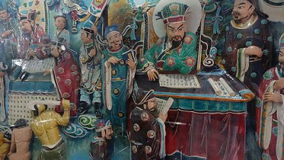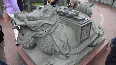 ▲それがこの亀の石像です。角やひげが生え、口からは長い舌が突き出ていて、到底亀には見えませんが、亀なんだそうです。この亀の甲羅を撫でると、金運がアップすると言われています。一緒に居合わせた現地のおばちゃんグループは、これでもかとばかりに亀の甲羅を撫でまわしていました。