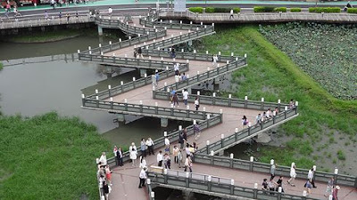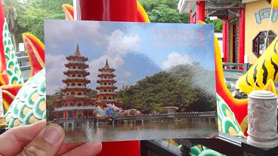 ▲龍虎塔へは、蓮池潭の上にかけられたジグザグ形の橋を渡っていきます。なぜこんな面倒くさい形の橋にしたのか……。でも渡り始めるのはちょっと待って下さい。橋の入口に既にご利益スポットが有るんです!