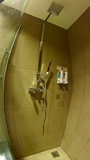 ▲シャワーはレインシャワーとハンドシャワーが備えられています。共用ボトルタイプではありますが、ボディーソープとシャンプーもあります。