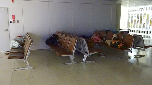 ▲到着出口の壁際には多数のベンチが用意されています。しかし、到着して休む人や、出迎えの人でがやがやしているので、決して仮眠できそうにはありません。