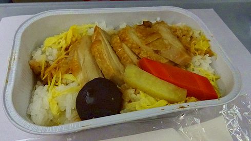 ▲さて、離陸後しばらくすると、機内食がサーブされ始めます。サプライスでのチケット購入の場合、機内食は1食分デフォルトで付いてきます。チキンの照り焼きライスが配られます。