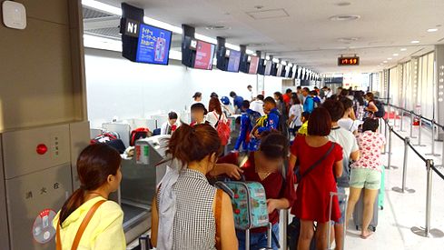 ▲車寄せに面する形でカウンターが並んでいます。こんなところに追いやられてしまっているなんて……。タイ・エアアジアXは結構ぞんざいな扱いを受けていますね。それにしても、チェックイン待ちの行列が長いですね。今回は私はカウンターチェックインだったため、この行列に並ばざるを得ず、20分程度待たされました。ウェッブチェックインを済ませておいた人は、この行列を尻目に、次々に荷物を預けていました。やはり、ウェッブチェックインをしておいたほうがスマートですね。