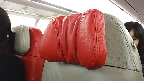 ▲エアアジアXのシートで嬉しいのが、このヘッドレストですよね。左右に折り曲げることが出来、さらに上下の高さも調整できるので、しっかりと頭を固定できて寝るのに好都合なのです。同様にA330で長距離便を飛ばしているセブパシフィックのシートには、こういった機能はありません。