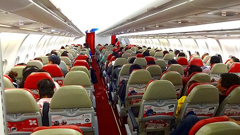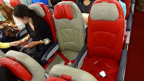 ▲機内では、エアアジアのコーポレートカラーの赤がかなり目を引きます。CAさんも全身真っ赤な制服です。それにしても、結構人が多いなぁ。これではエコノミーフルフラットで横になって寝るなんてことも出来なそうです。