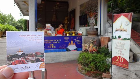 ▲ワット・サケットのチケット(20バーツ)を購入します。チケット売り場では、お坊さんが直々にチケットを販売してくれます。ありがたいことです。
