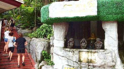 ▲丘の上の本堂へと続く階段を登っていきましょう。登り口には見猿聞か猿言わ猿の三猿が飾られていました。三猿の発祥の地はインドだとも言われていますので、海の道を伝わってきたのでしょうか。