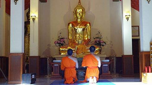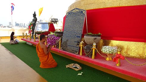 ▲仏塔の前でお坊さんがお経をあげていました。その他にも、タイ人の女性もお祈りをしています。観光客である我々は、邪魔をしないように気をつけましょう。