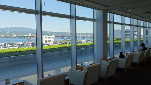 ▲さて、やはりこのラウンジの目玉は、この開放感抜群の素晴らしい見晴らしでしょう。長崎空港は大村湾に浮かぶ島の上に作られているのですが、ラウンジからは海を隔てた対岸の大村の街を一望できるのです!こんなに素晴らしい見晴らしの国内空港ラウンジは、ここ以外に存じません。本当に眺め抜群なので、長崎空港を利用する際はぜひ立ち寄ってみてください!