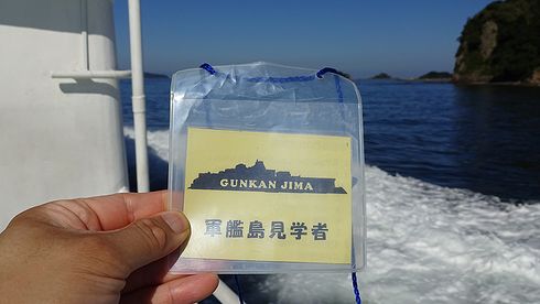 ▲船内では、見学者証が配布されます。ピンクや黄色など幾つかの種類があり、色頃のグループに分かれて島内を見学することになります。