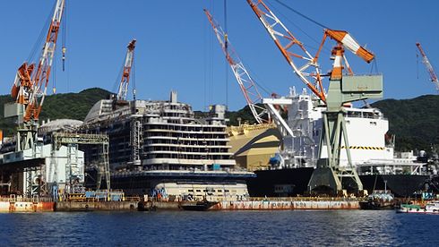 ▲定刻通り午前9時に長崎港を出発し、軍艦島へと向かいます。長崎港には大型船の造船所がいくつかあり、巨大な豪華客船が建造中でした。