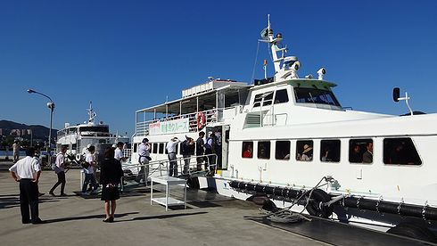 ▲乗船開始は8時40分。多くの人が、やまさ海運の誇る「マルページャ号」に乗り込みます。