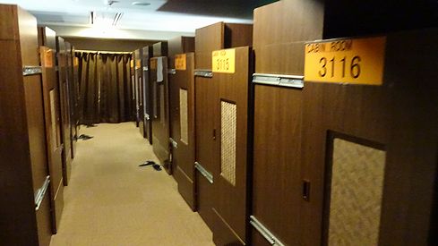 ▲さて、本日の寝床になる簡易個室をチェックしてみましょう。まるでネットカフェのような作りですね。(というか、ほぼネットカフェです。)簡易個室のドアは、ネットカフェのそれと同様に鍵かかかりませんのでご注意を。