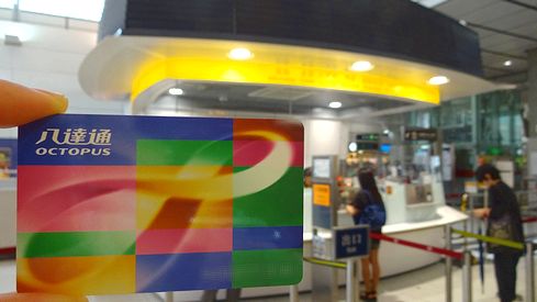 ▲窓口でオクトパスカード(150HKD)を購入します。これは日本のスイカなどと同じIC乗車券で、改札でこれをかざすと自動的に精算されます。このカードの利用でMTRの乗車料金が割引になりますので便利でお得です。