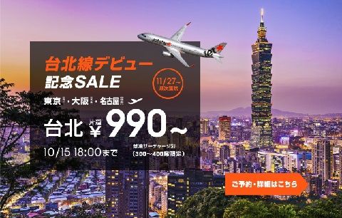 今回のセールは、ジェットスター・ジャパンの台北線就航を記念してのものです。大阪、東京、名古屋からの各路線に順次就航していきます。990円チケットも、数に限りはありますがそれぞれの路線で発売されます。