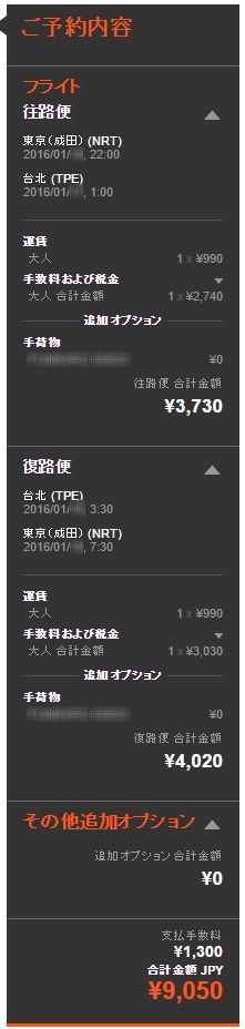 となり、合計で9,250円、さらにクレジットカードの支払い手数料1,300円が加算され、トータルでは10,550円で台北旅行ができてしまいます。これはなかなかお得!