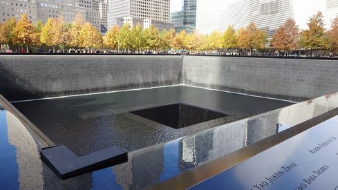 ▲グラウンド・ゼロに移動し、跡地に作られた巨大なプールについての解説がありました。ツインタワーの跡地にはそれぞれ巨大な正方形のプールが作られています。プールの中央にも、もう一つ小さなプールがあり、2段構造になっています。1段目はビルが失われてしまったことを、2段目は多くの命が失われてしまったことを暗示しているのだとか。