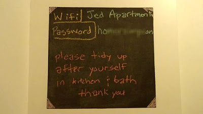 ▲共用スペースの黒板には、ホストのJedさんからの注意書きとWifiのパスワード等の案内がありました。
