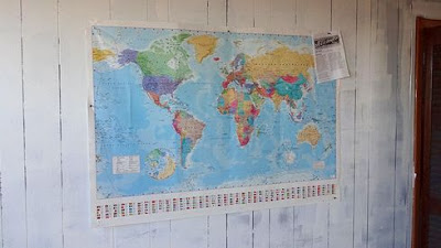▲リビングルームの壁には、世界地図がはられていした。世界各国からくるゲストと、これを見ながら談笑するのだそうです。
