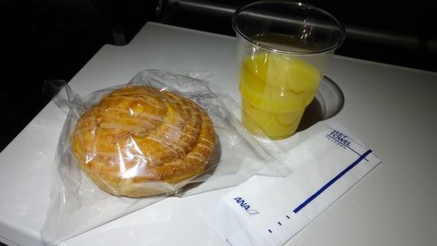 ▲間食として、往路便ではシナモンロールが提供されました。ちなみに復路便ではラップにくるまれたサンドイッチでした。