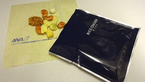 ▲長距離フライトの唯一の楽しみは、機内食ですよね。ANAはエコノミーの機内食がまだマシなので安心できます。離陸後しばらくすると、最初におかきがサーブされます。