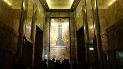 ▲エントランスホールは天井が高く、堂々とした風格のある空間でした。正面には、ビルの先端から世界を照らすエンパイア・ステート・ビルのレリーフが飾られています。