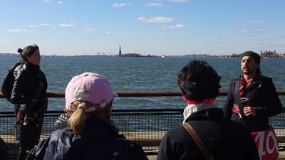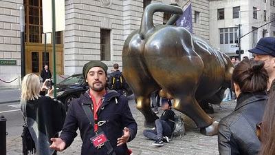 ▲今回の英語のツアーをガイドしてくれたのは、こちらのゼフ(Zev)さん。知識豊富な、よく声の通る方でした。早速マンハッタンの南の端のエリアを回るツアーが始まります。まずはウォール街のシンボルとしても有名な「チャージング・ブル」の銅像から。これは、株価を上げる縁起物なのだとか。ブルの股間に入って記念撮影するのが人気なのですね(笑)。