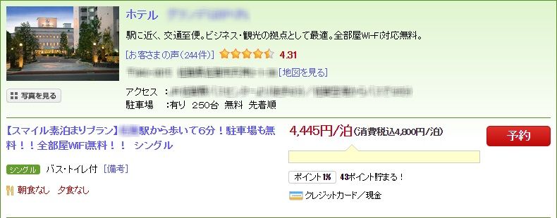この電話予約の際に、楽天トラベルでの表示料金から、さらに1,500円が値引きされるのです!そもそも楽天トラベルは通常料金でも非常にお手頃です。例えば上記画像のホテルでは、評価が高めにも関わらず、素泊まりが4,800円と驚きの価格に設定されています。普通なら、ここでオンライン予約をしてしまいたくなりますが、一手間かけて電話予約を利用することで、このお値段からさらに1,500円が割引され、税込3,300円になるのです!